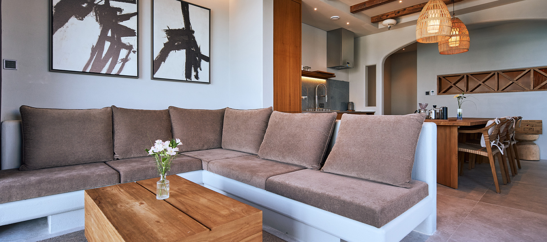 그리스 산토리니의 영감을 받은 인테리어와 자체제작 가구들로 쾌적함과 고급스러운 분위기를 동시에 느끼실 수 있습니다.